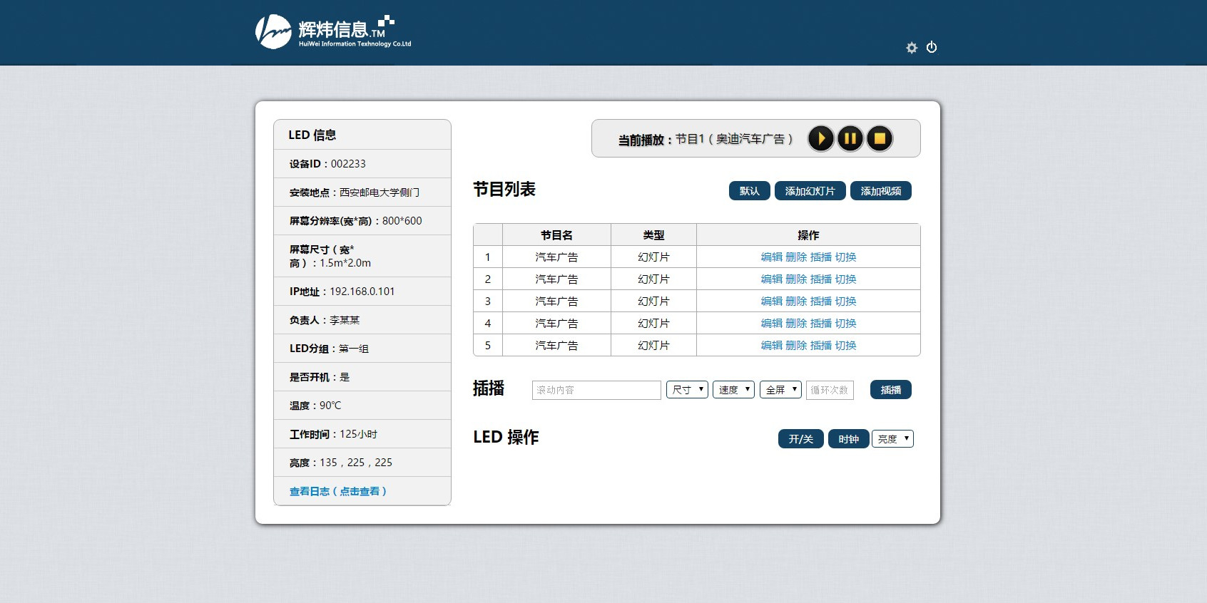 LED显示屏远程管理平台 LED display remote management website 这是我在校期间参与的一个项目,LED显示屏web端管理平台,基于Jquery+PHP,负责实现所有代码。 This is a project I developed when I was in college, based on Jquery and PHP, I wrote all code. LED屏幕信息 LED幻灯片管理 Products List LED视频管理