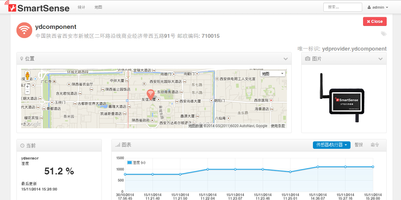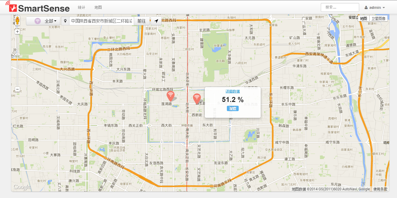 每个传感器产品都内涵一个GPS芯片,通过Wifi或3G传输,将位置和最后一个数据显示在地图上